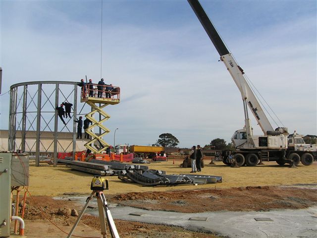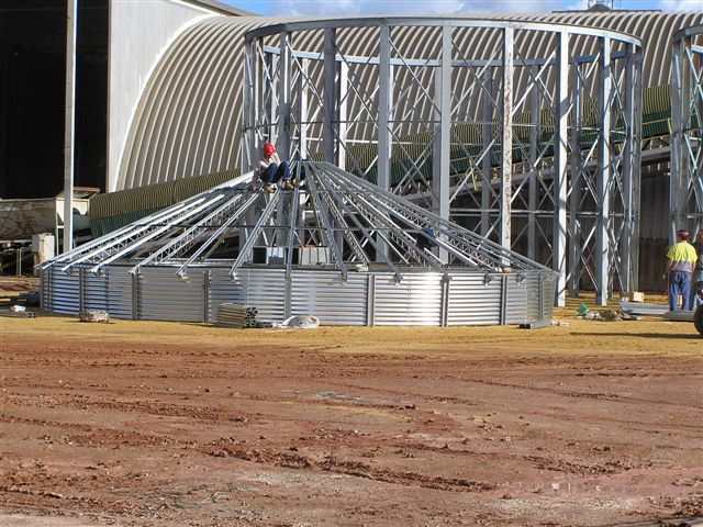 (5) 頂蓋:由幅梁、倉頂蓋、張力圈、通風口、頂帽等構(gòu)件組成。倉頂骨架設(shè)計采用空間結(jié)構(gòu)技術(shù),可以保證大跨度設(shè)計載荷下的穩(wěn)定性,同時減小構(gòu)件的尺寸。