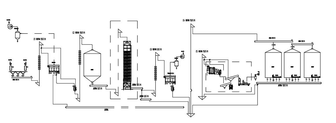 一路 卸濕糧清理后進入烘干塔,然后進入3臺5000噸干糧倉。