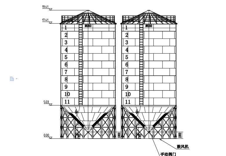 此項(xiàng)目為2套500T玉米鋼板倉(cāng),其工藝流程如下:糧食經(jīng)提升機(jī)送到2-500T鋼板倉(cāng)中,通過(guò)測(cè)溫系統(tǒng)和鼓風(fēng)機(jī),環(huán)形風(fēng)道保證玉米的安全存儲(chǔ)。